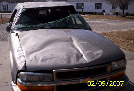 All the windows except for the back 2 were blown out, and the windshield was shattered and falling inside. Most everything in the truck flew out, including my left shoe off my foot, the spare tire, and everything that was loose inside the truck, like my mail, junk, cd's, a box of tools and jumper cables.