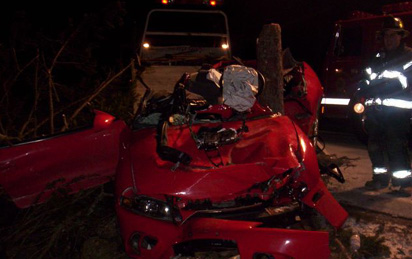Wappinger Falls, NY - On Friday January 21, 2005 at 00:32 the Hughsonville Fire Department and Town of Wappinger Ambulance were dispatched to a serious injury accident on Old Hopewell Rd near the fire station. On the arrival of Chief Glenn Kramer he found a Mitsubishi Eclipse that had hit and snapped a pine tree on the drivers side. Upon further investigation Chief Kramer found one victim staggering around the scene who then collapsed, it was determined that this was the passenger of the vehicle and that the driver was still trapped. A helicopter from Stat Flight was dispatched and landed at the Hughsonville Fire Station.