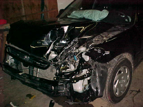 Hi, Here is my accident. It happened on Nov 2, 2000. I was driving down the lane in a parking lot when I saw some headlights out of the corner of my eye. I quickly slammed on the brakes but sure enough I was hit. My Honda Civic encountered a GMC Sierra (needless to say, my Honda lost), he hit me so hard, my car turned 90 degrees. His truck had a dent in the bumper.